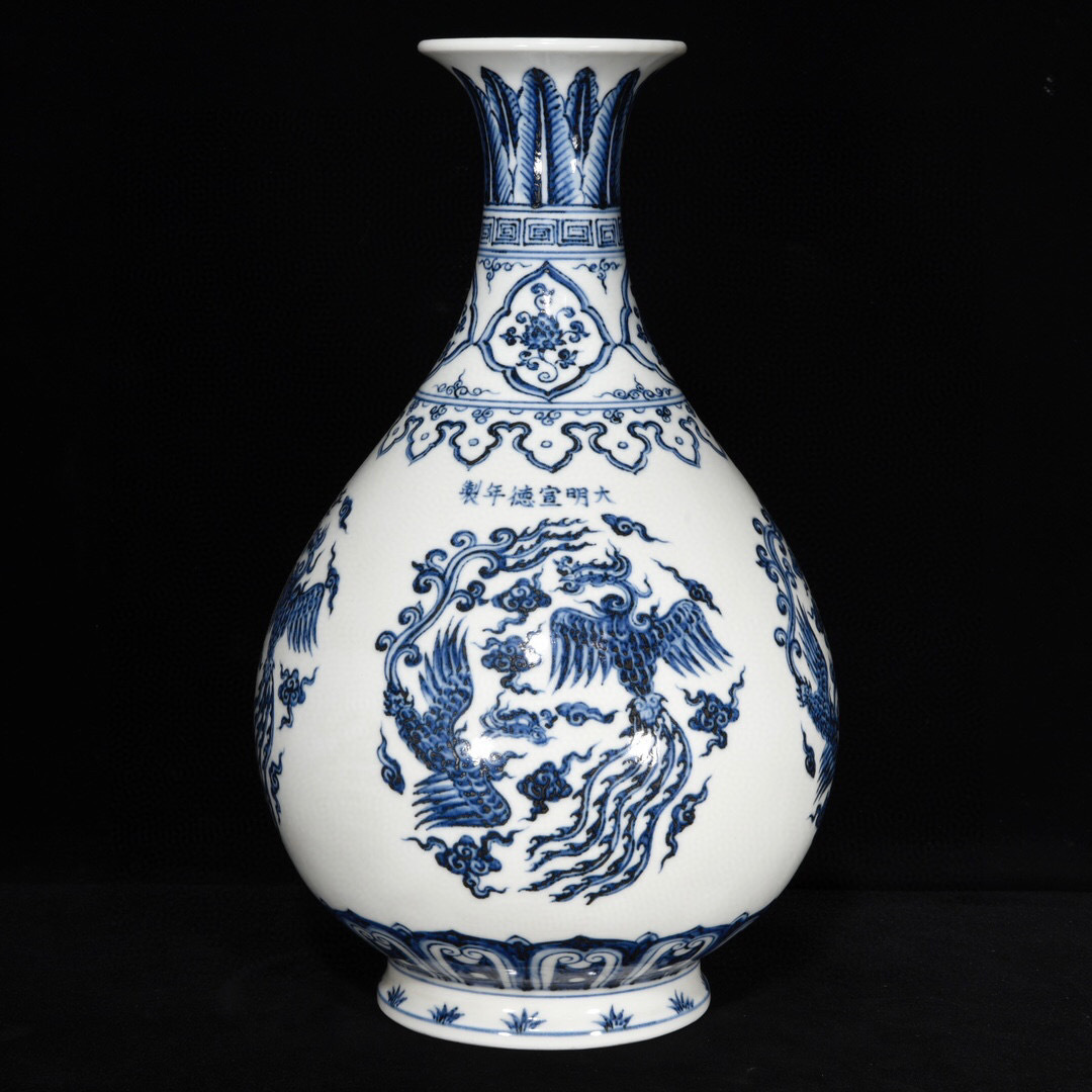 - 『明・宣德年製款・古陶瓷品・青花・團鳳紋・玉壷春瓶・花瓶・花器』極細工 置物古賞物 中国古玩 中国古美術