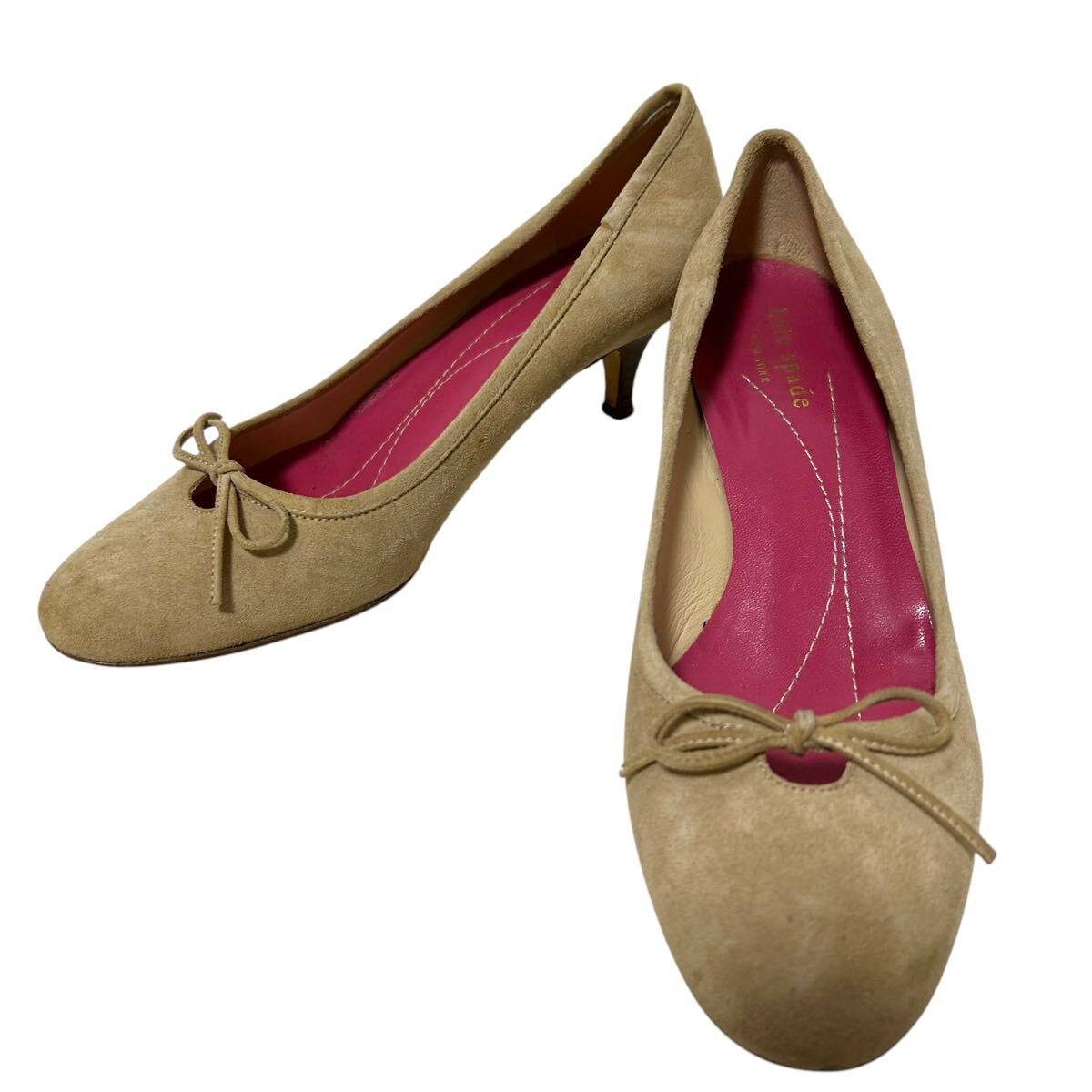 > ※P1 kate spade(ケイトスペース) レザーヒールパンプス スエーリボン ベージュ イタリア製 表記6(23cm相当)