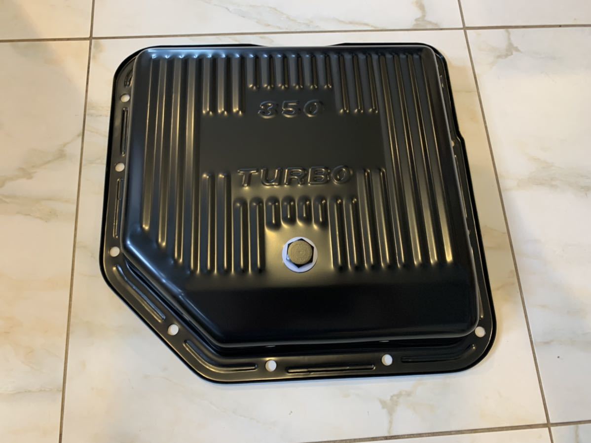 > シボレーTH350ブラックパウダーコートミッションオイルパンフィンド新品。インパラベルエアカマロホットロッドラットローライダー