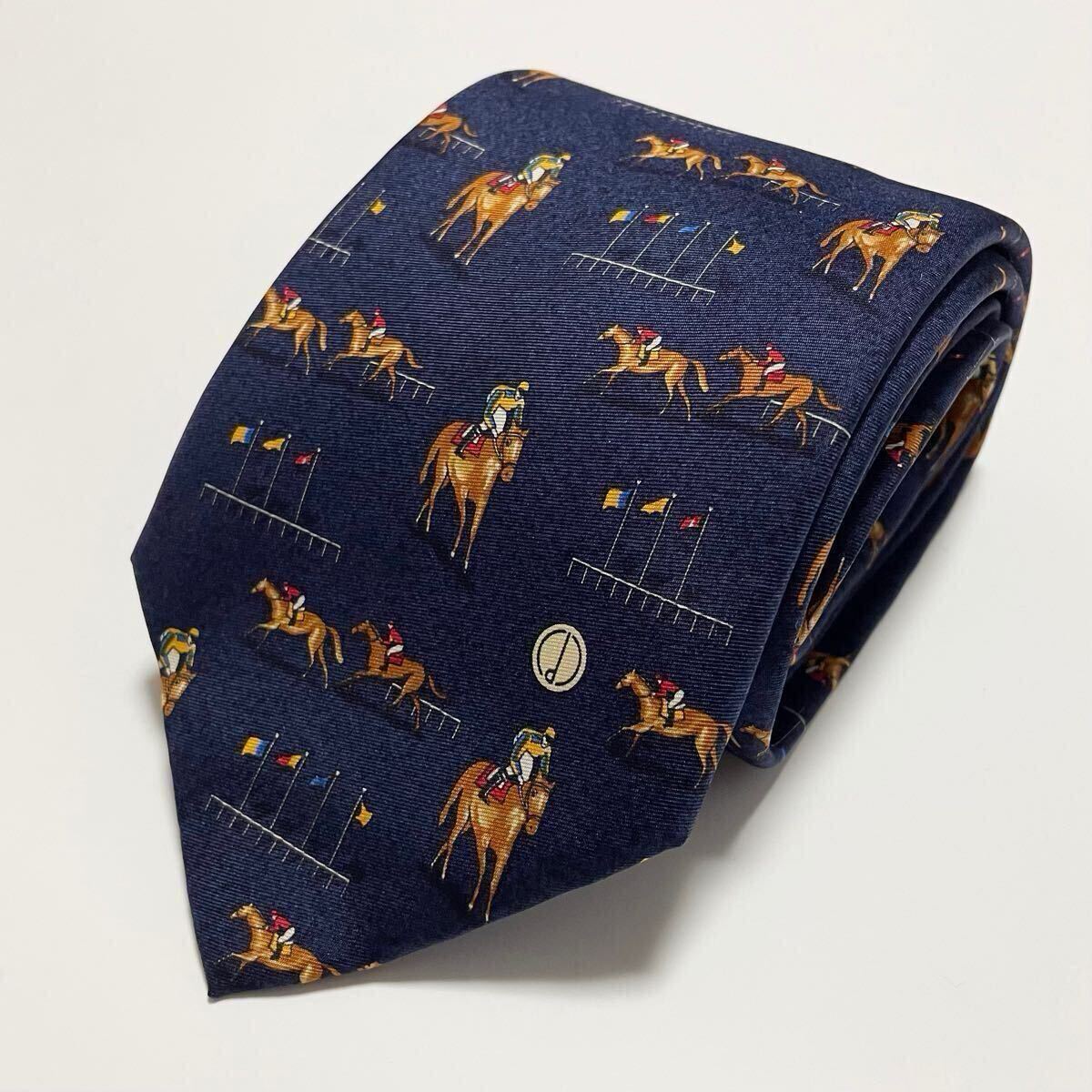 - ★美品 dunhill ダンヒル 騎手 馬 総柄 ネクタイ シルク100% ネイビー 紺色 メンズ 男性【鑑定済み 本物保証】