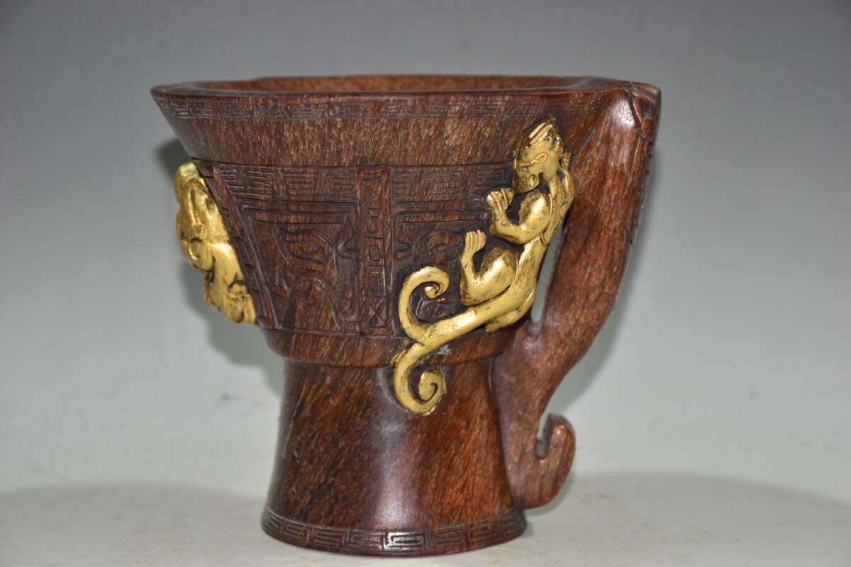 - 『清・康熙年製款・古角材彫・赤虎龍杯・流金・魚子紋・置物』極細工・東洋彫刻・骨董品・古賞物・中国古玩・中国古美術
