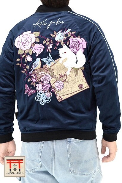 > 「ハートの形の薔薇のリース」ベロアスカジャン◆今昔 ネイビーXLサイズ KJ-29219 和柄 和風 狐 きつね 別珍 刺繍