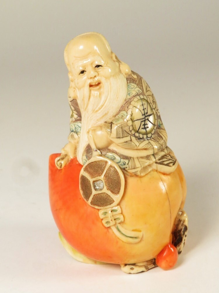 - 【9348】明治期 桃仙人 牙 置物(初品・買取品)