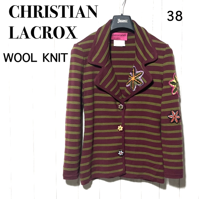 > クリスチャンラクロワ ニットジャケット 38 CHRISTIAN LACROIX ウール ストライプ ボーダー 刺繍ワッペン
