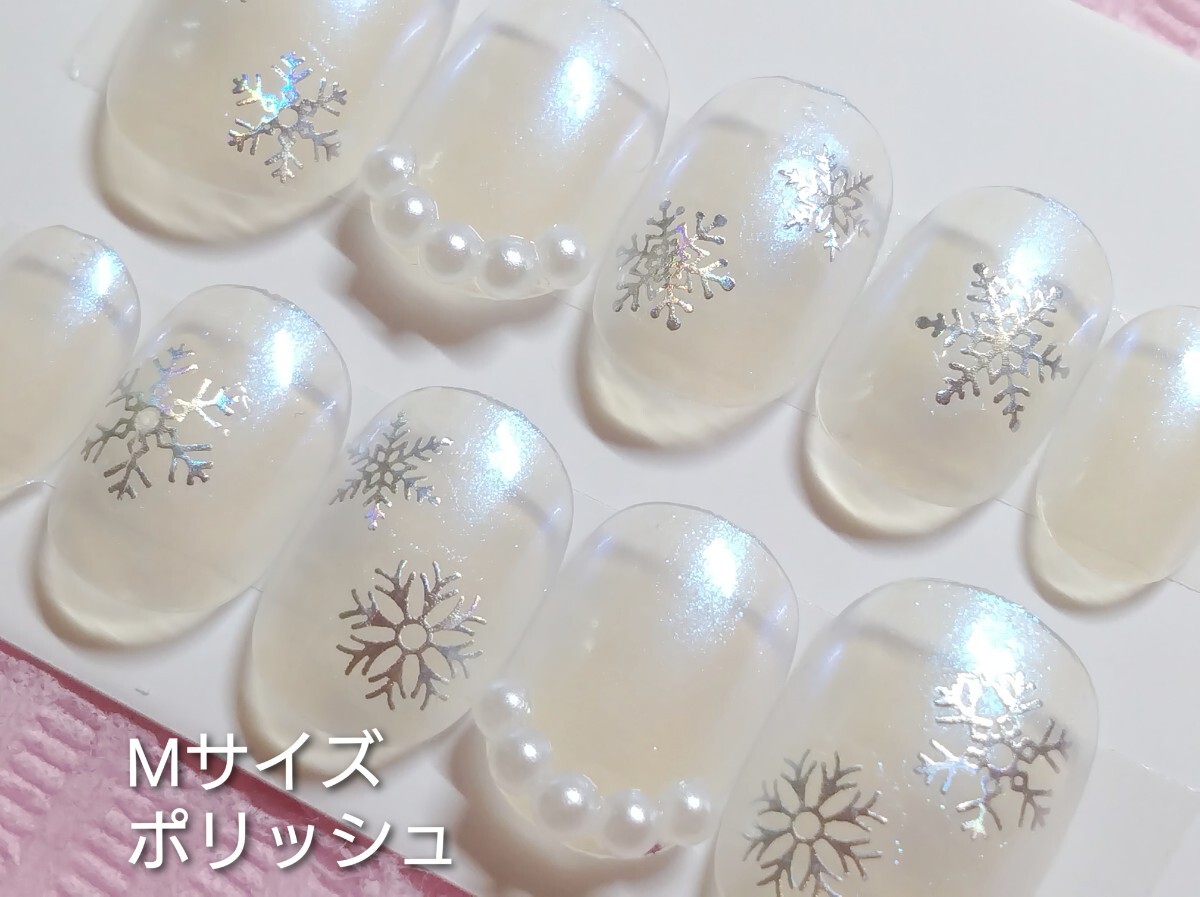 - Mサイズベリーショート・クリア偏光パール雪の結晶ウィンターネイルチップ冬ネイル