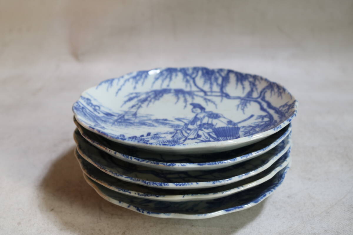 - 【伊董】B197.アンティーク!大正ロマン!珍品!古い陶磁器印判皿5枚セット小野道風柳に蛙の図花札印判皿明治~大正7寸7分 #印判 #古道具