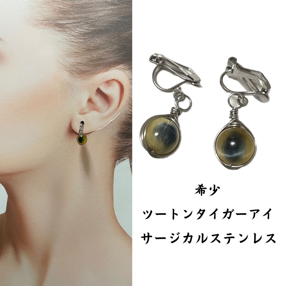 - TT6. 天然石 イヤリング 希少 レアストーン ツートン タイガーアイ アレルギーフリー ニッケルフリー サージカルステンレス ハンドメイド