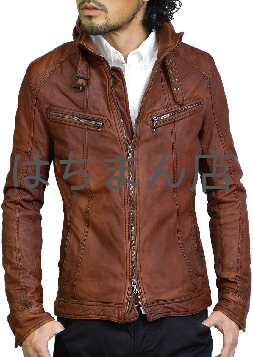 - レザージャケット メンズ 本革 ラムレザー シングルライダース ライダースジャケット 革ジャン 皮ジャン キャメル 茶 秋冬 S-3XL