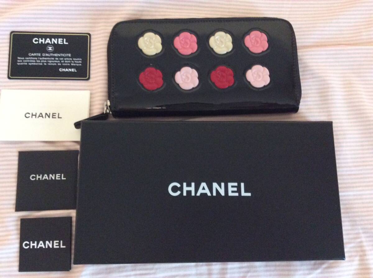 > ★パリ発イタリア製【CHANELシャネル未使用】大人気カメリア&ロゴマークエナメル長財布★ブラックエナメルファスナー付★新生活プレゼント