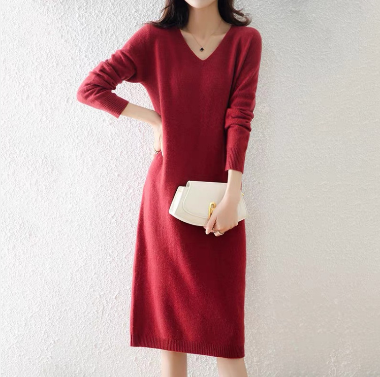 - 秋冬美品*オシャレ Vネック ワンピース 秋冬 ニットワンピース 膝丈 長袖 気質良い きれいめ 大人 着痩せ ニットワンピース*赤