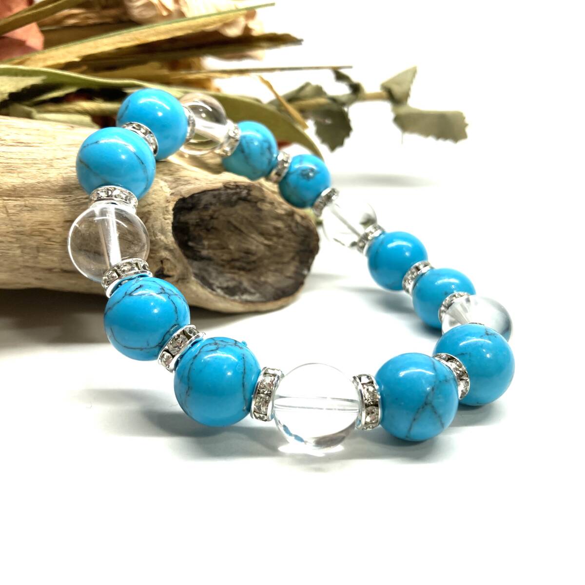 - ターコイズ&水晶 パワーストーン ブレスレット (シルバー) 12mm 幸運 開運 メンズ 男性