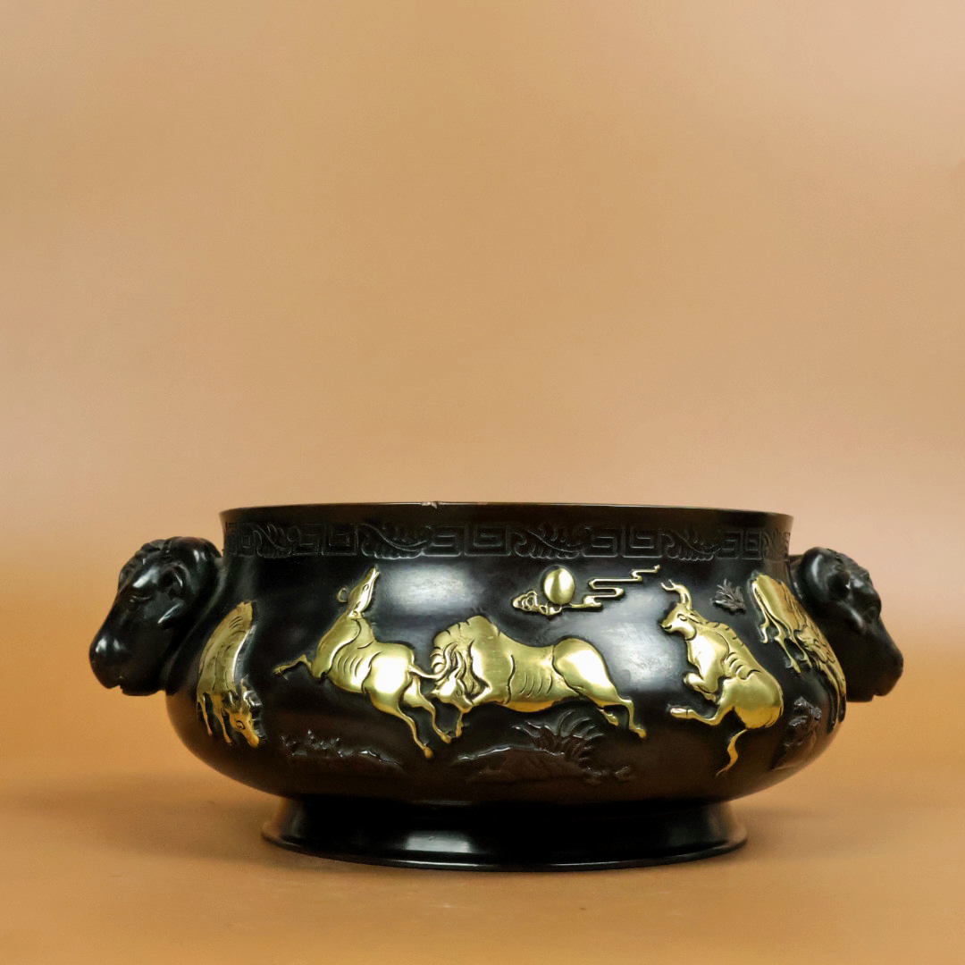 - 『明代・宣德五年工部製款・宮廷御製・紫銅流金彫・浮彫流金牛・羊耳炉・香道』極細工・時代物・東洋彫刻・古賞物・中国古玩・中国古美術