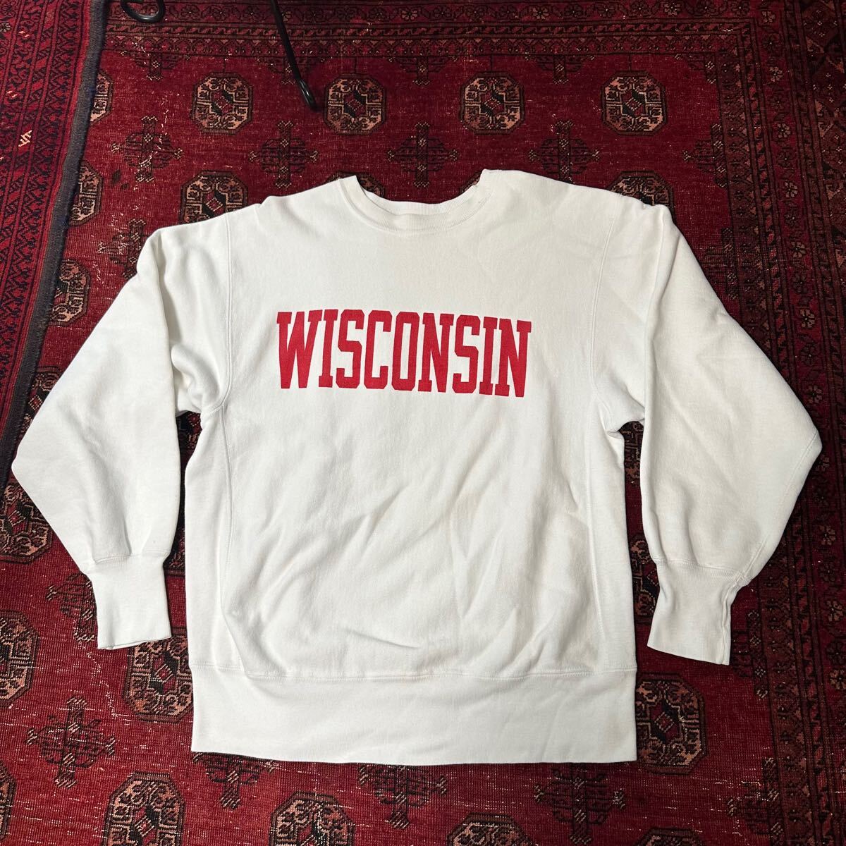 > 染み込みプリント 90s チャンピオン ホワイトボディー 程度◎ LARGE リバースウィーブ スウェット 刺繍タグ ヴィンテージ 70s 9 80s