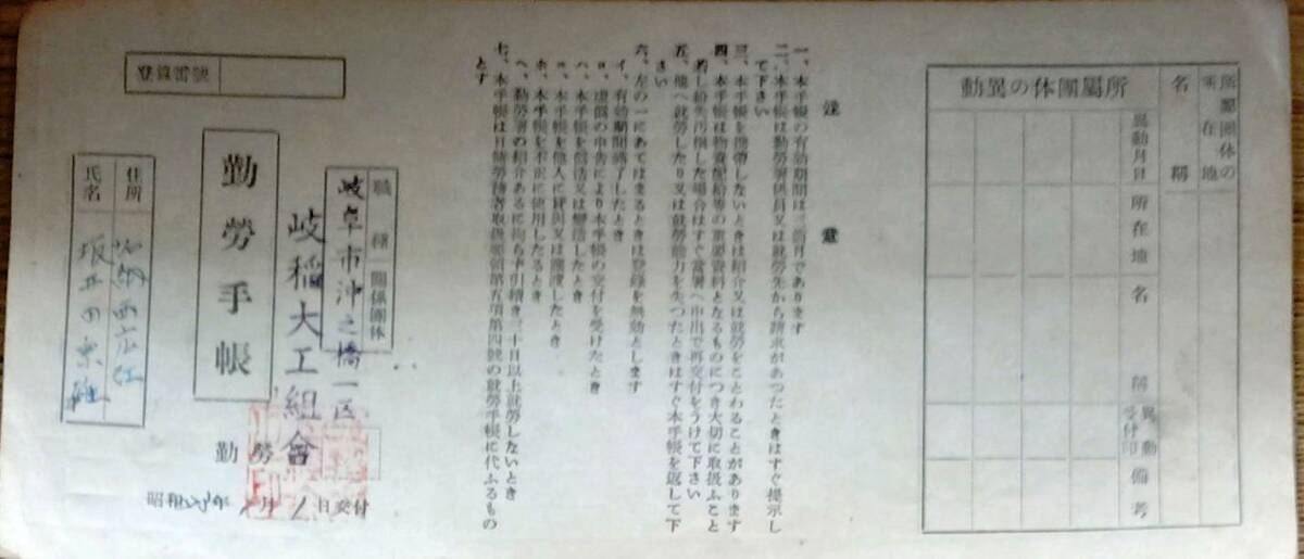 - f25010511〇大工組合勤労手帳 岐阜県 昭和23年〇和本古書