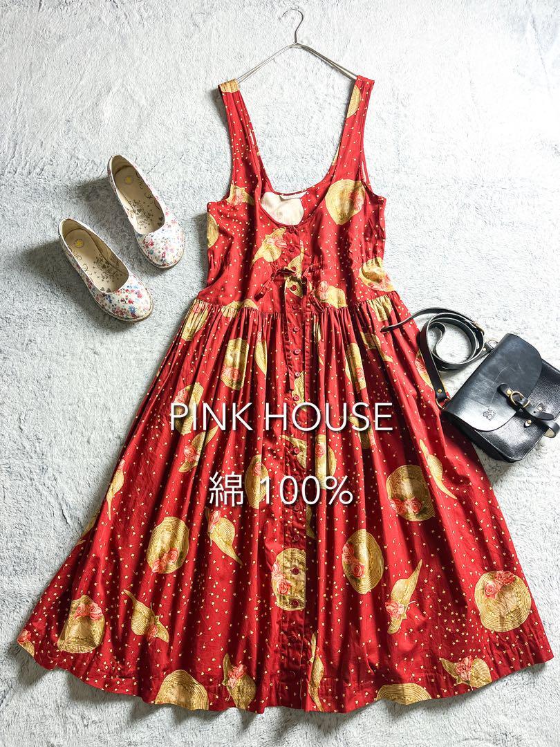 - 【PINK HOUSE】ピンクハウス 麦わら帽子柄 前開き ロングワンピース F