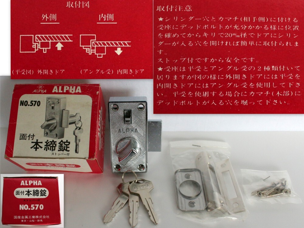 - 1110/未使用品・長期保管品/ALPHA アルファ 面付本締錠ストッパー付 No.570 1個 鍵-3本付 ★セキュリティ.防犯.カギ