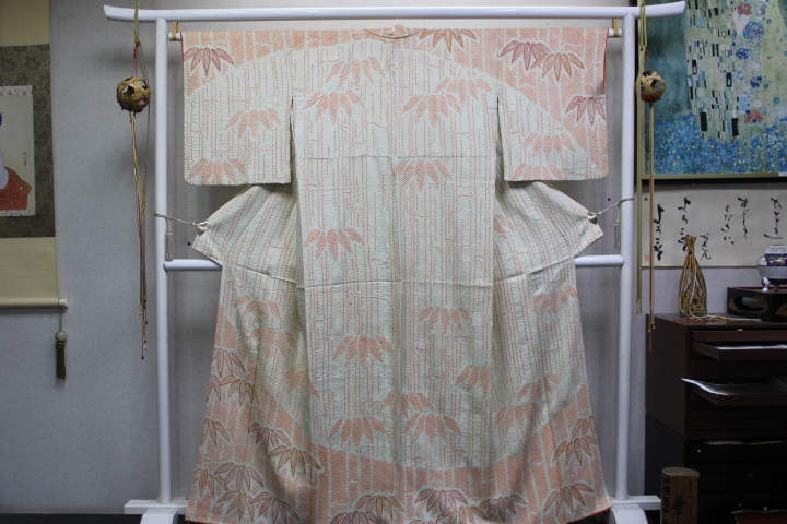 - きもの今昔8064 訪問着 高級総絞り絵羽付け訪問着 アイボリー地色に橙色竹林柄 問題なく極上品 身丈165cm