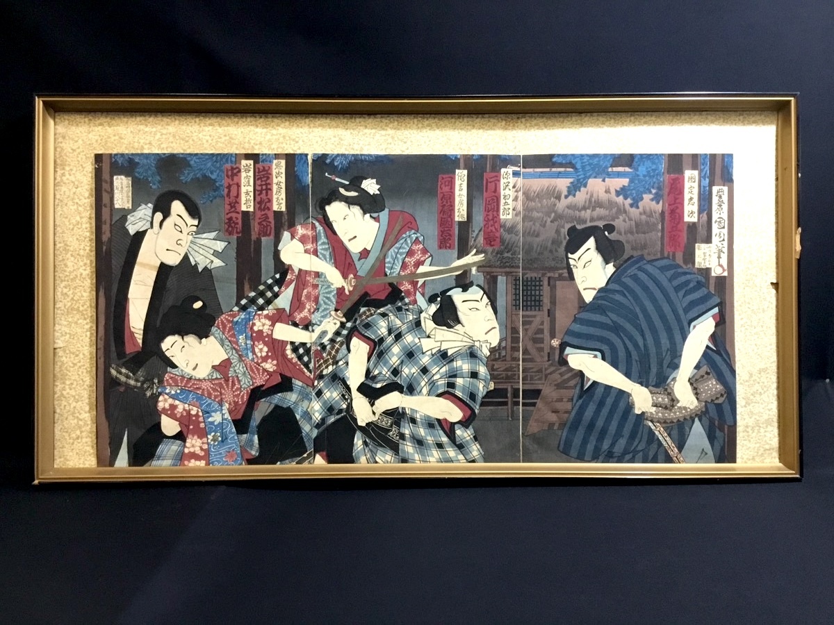 『豊原国周 明治時代 木版浮世絵 「赤坂松並木飛脚殺の場」 3枚続揃い 国定忠治 』