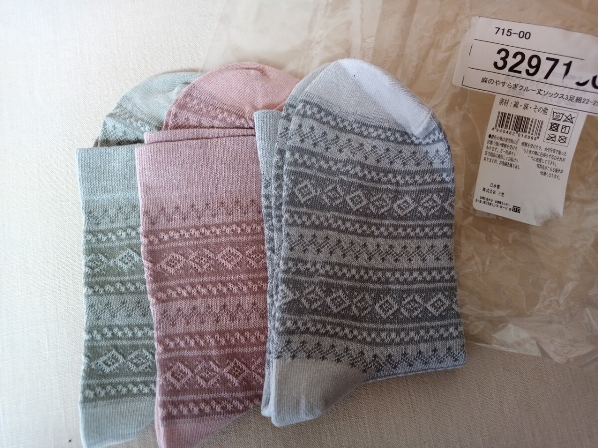 - 10792 ★★ 日本製 三笠 麻のやすらぎクルー丈ソックス3足組 サイズ22〜25cm 新品