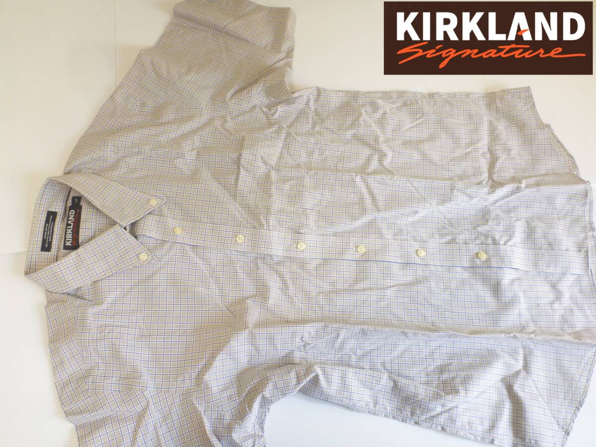 > 新品未使用 KIRKLAND カークランド★上質コットン100 ノンアイロン 青×茶×白 チェック柄 半袖シャツ L