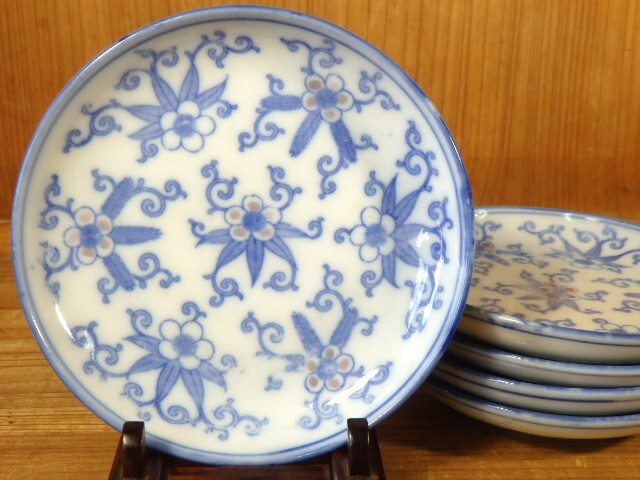 - ◆図変わり印判皿:3:◆『梅花:松竹唐草模様』◆明治期◆取り皿◆小皿◆5客◆