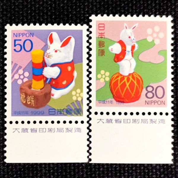 > [25012119] 年賀切手【平成11年・1999年用 うさぎ】単片2種 銘版付「餅つきうさぎ・玉乗りうさぎ」50円+80円 1998年発行 美品