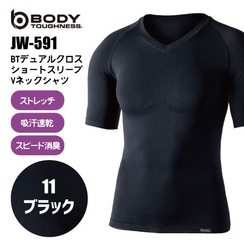 > おたふく手袋 BODY TOUGHNESS(ボディータフネス)【JW-591】 ショートスリーブ Vネックシャツ(ブラック)LーXLサイズ ネコポス発送