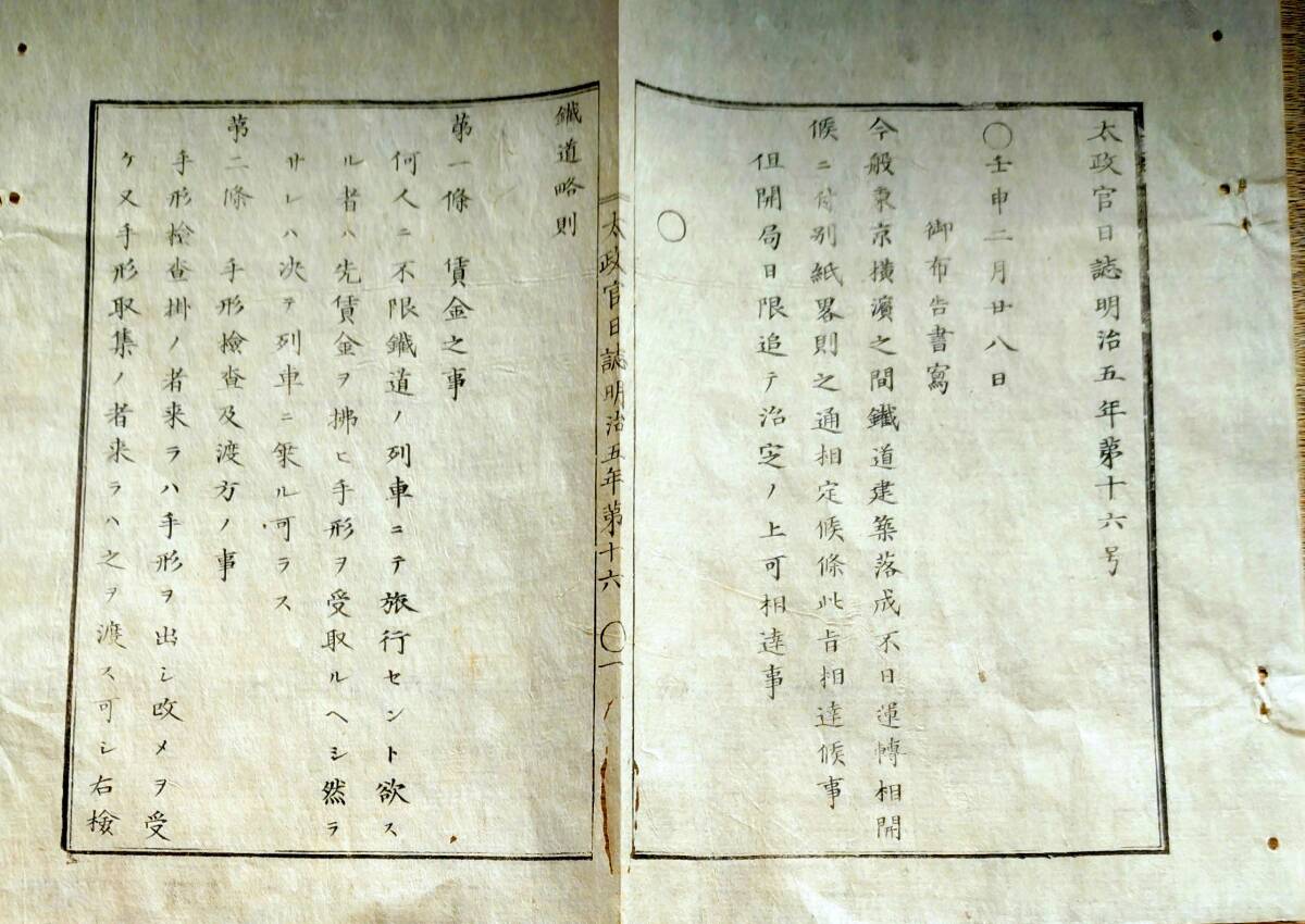 - f25012516〇太政官日誌 明治5年壬申 第16号〇東京横浜鉄道略則御定 第1条~第23条〇和本古書古文書