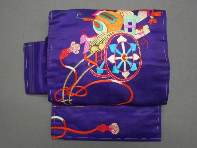 - 名古屋帯 [A21469] 刺繍 宝尽くし 長さ342cm 幅30cm 半幅15cm 古布 古裂 リメイク 材料 和服 衣装 リサイクル着物
