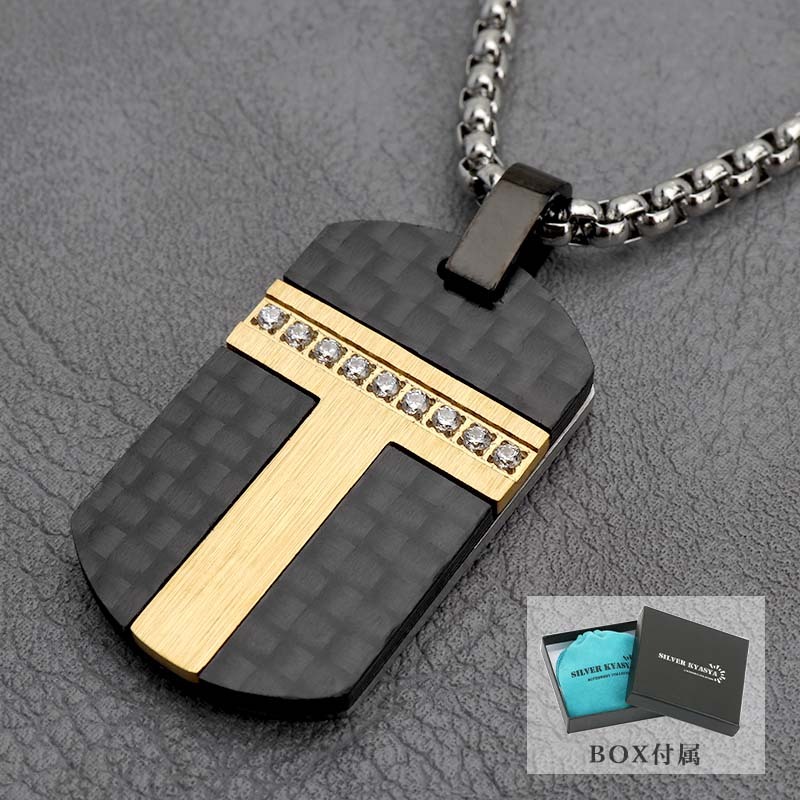 - シンプル 高級感 メンズ カーボン模様 ドッグタグネックレス ブラック プレートネックレス 黒 チェーン付き 専用BOX付属