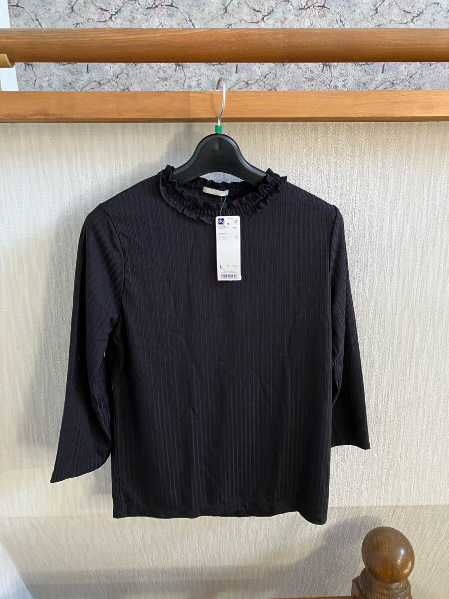 - 秋未使用★GUジーユー黒フリルネックT七分袖リブトップスL★