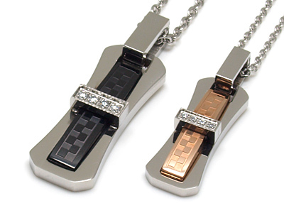 > ★人気★お勧め★肌に優しい★金属アレルギー&温泉&海水浴ご使用OK★ステンペアネックレス★ピンクGD&ブラック市松模様&ジルコニア