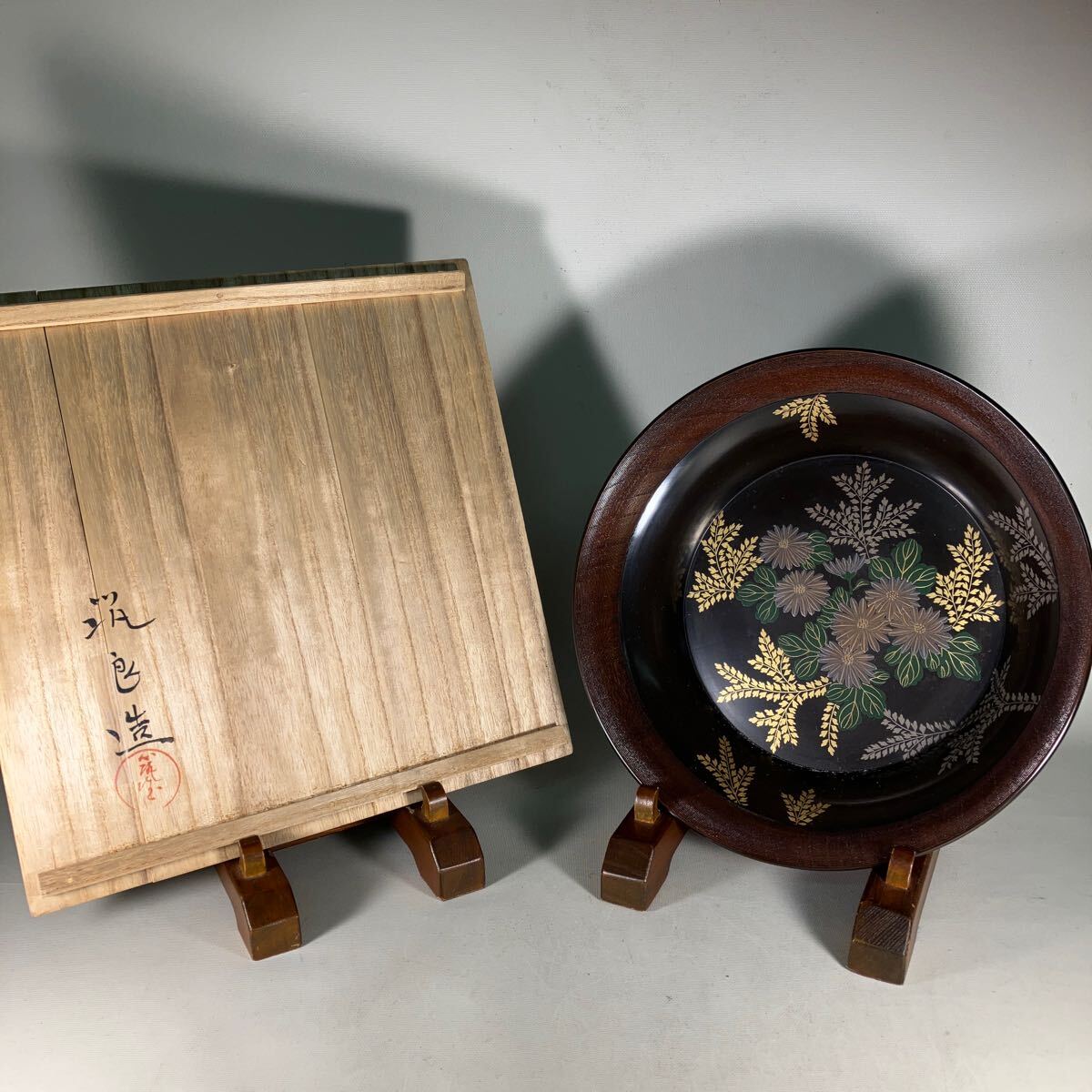 - 筑城筑良造 山中塗 菊花時絵菓子鉢 共箱(共箱に割あり) 菓子器