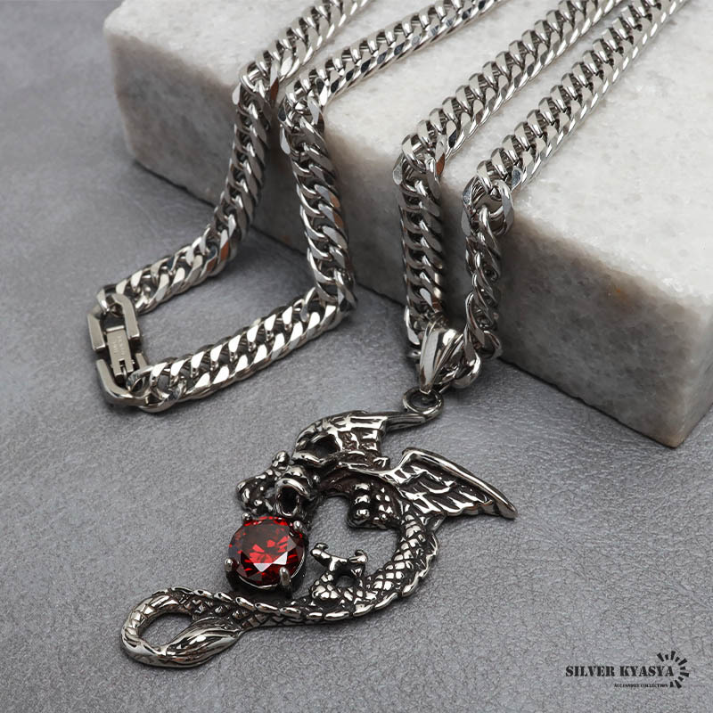 - (50cm) ステンレス ドラゴンネックレス レッド シルバー ダブル喜平チェーンネックレス 幅6mm 龍