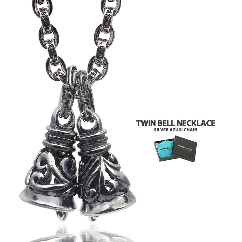 - (60cm) ベルネックレス ペーパーチェーン 梵字 真言 シルバー 銀 燻し ツインベル 鐘 唐草 BOX付属