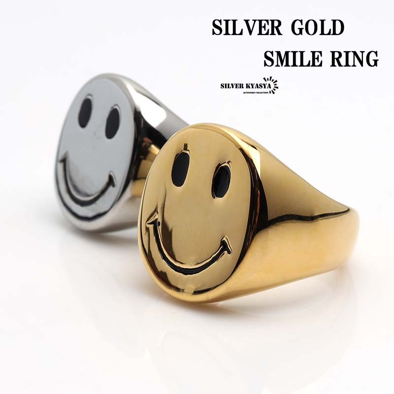 - (シルバー、26号) ニコちゃんリング 印台リング シルバー ゴールド指輪 スマイル スマイリーフェイス リング 円形 鏡面