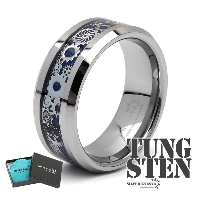 - (22号) タングステン 歯車リング 指輪 リング ブルー シルバー メタリック ギア 金属アレルギー対応 専用BOX付属