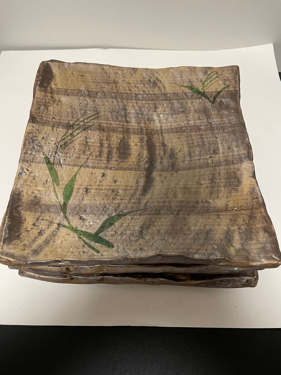 - 手作り 陶器 四角形皿 茶色 植物模様 21cm角202500205