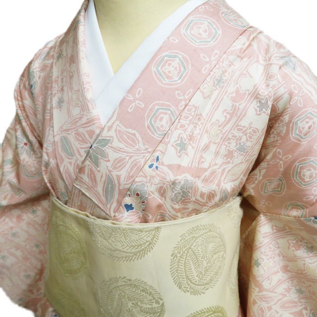 > 紬地 着物 中古 正絹 袷 カジュアル 花模様 似桃色 多色 身丈156.5cm 裄64.5cm M きもの北條 A1145-8