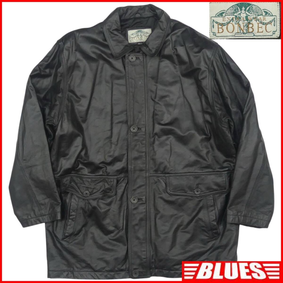 - 即決★BONBEC★メンズ L レザーステンカラーコート ボンベック 黒 本革 ジャケット 本皮 革ジャン ロングコート カーコート ジャケット