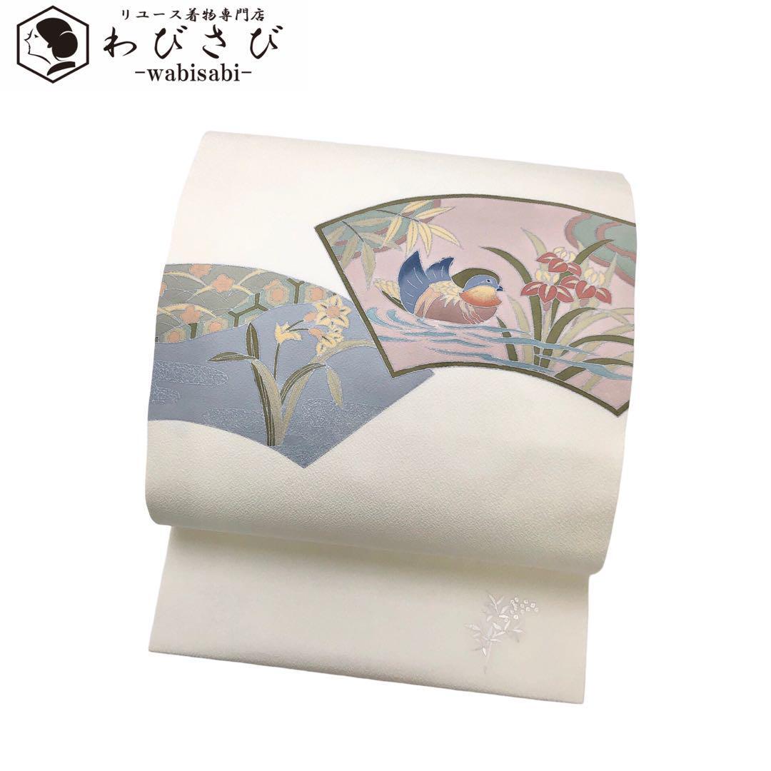 - 名古屋帯 手描き 地紙に花鳥模様 菖蒲 乳白色 銀彩 縮緬 O-4661 着物 きもの kimono 和服 和装 中古 リサイクル着物 【送料無料】