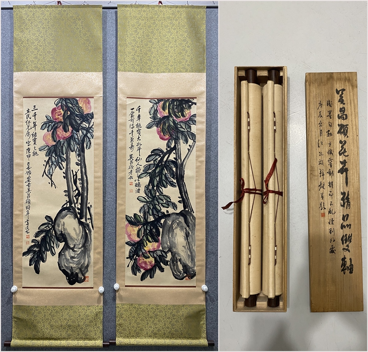 > 古美術 掛け軸 中国・近現代 「呉昌碩書」 紙本 【寿桃図 対屏】 立軸 書道 巻き物 肉筆保証 唐物 古画 画心111x41cm LT-250258