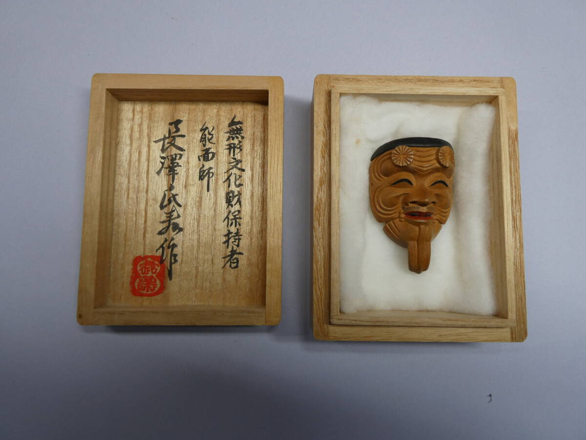 - 人間国宝能面師 長澤氏春作 木彫彩色 能面根付「翁」共箱付 装飾用額付