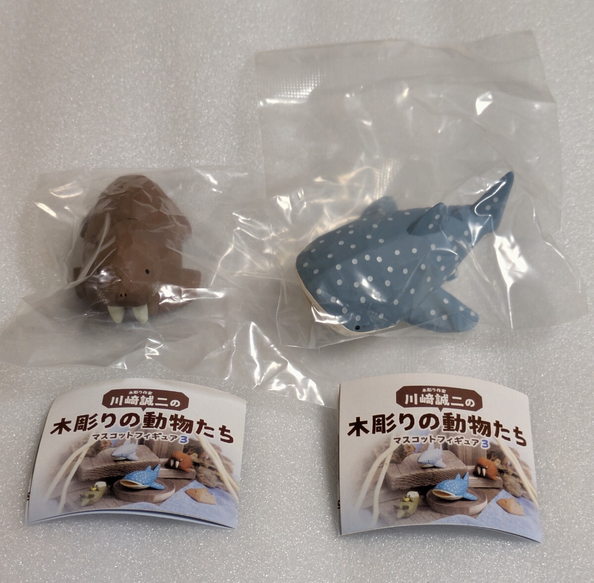 - 川崎誠二 木彫りの動物たち マスコットフィギュア3 2種セット じんべえざめ、せいうち ガチャ ガシャポン
