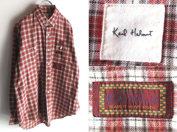 - Karl Helmut カールヘルム ロゴワッペン コットン ライトネル チェックシャツ BDシャツ M レッド ホワイト ピンクハウス カネコイサオ