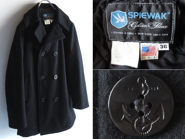- 希少 USA製 ビンテージ SPIEWAK スピワック 4101 アンカー釦 中綿/エコダウン入 裏地キルティング ウールメルトン Pコート 36 黒 ブラック