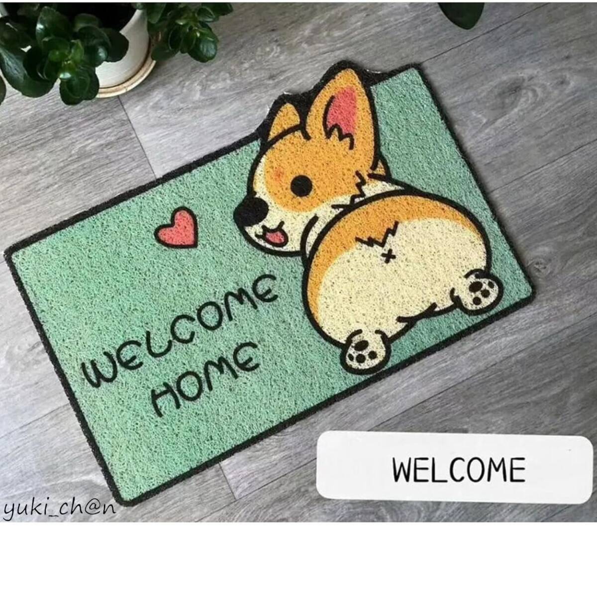 - 玄関マット ドアマット ウェルカムマット 40cmx60cm グリーン 犬 ワンちゃん コーギーおしり かわいい 屋外 室内