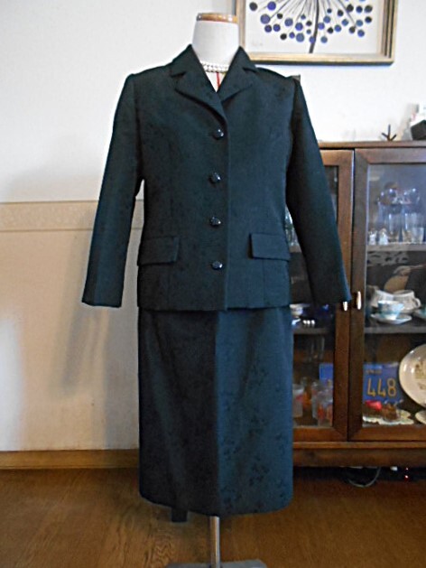> 昭和レトロ♪ハロー洋裁店(お仕立て品?)◆可憐な刺繍お花xドット地模様ブラックフォーマルスーツ 良品 W:約72cm(M相当?)