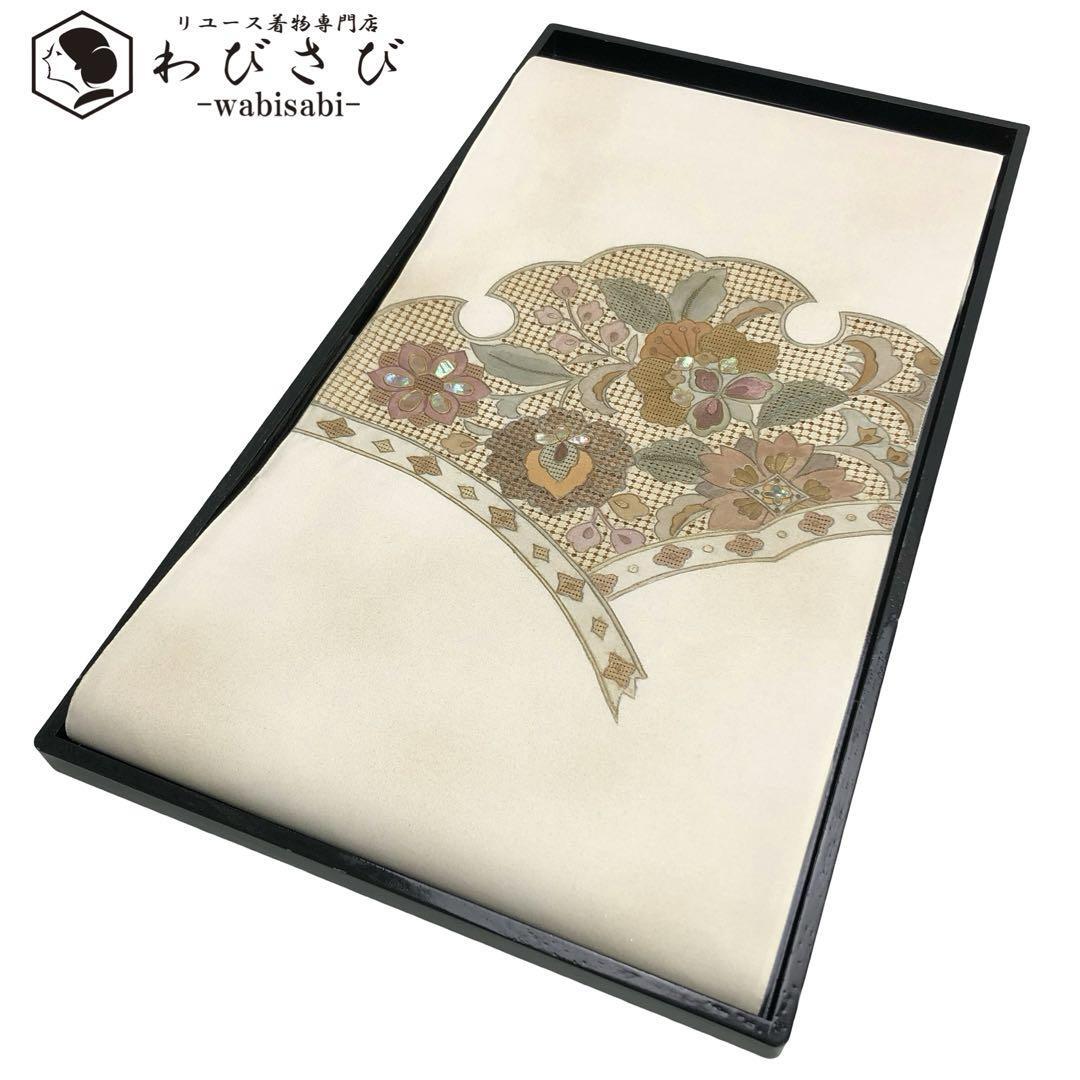 > 袋帯 花柄模様 螺鈿 汕頭刺繍 相良刺繍 乳白色 O-4681 着物 きもの kimono 和服 和装 中古 リサイクル着物 【送料無料】