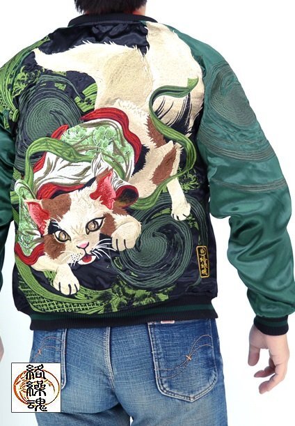 > 粋 猫又の戯れリバーシブルスカジャン◆絡繰魂 B色 XLサイズ 251002 和柄 和風 刺繍 スーベニアジャケット 化け猫 ネコ 妖怪